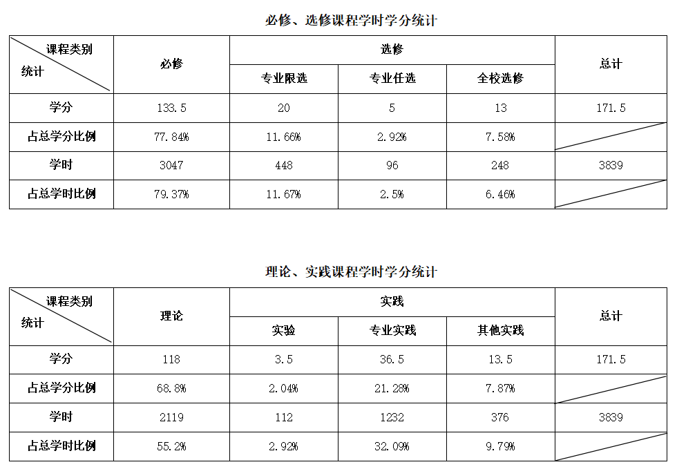 学制4年,修满171.5学分方能毕业。其中通识教育53学分(实践13.5学分),专业教育88学分(9.5学分),实践教育30.5学分。