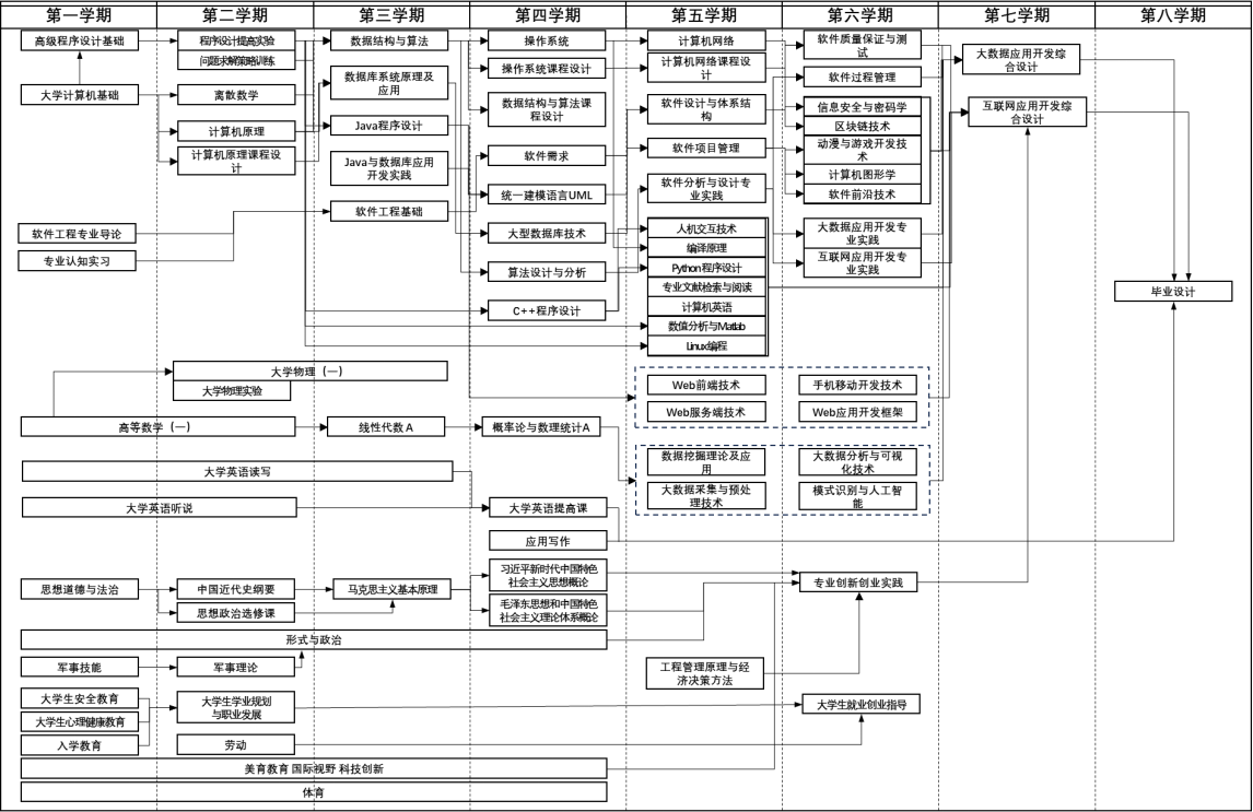 本专业学生主要学习自然科学和人文社会科学基本知识,掌握计算机科学、软件工程相关的基础理论和基本知识,接受软件工程实践和项目实施的基本训练,具备计算思维,能够运用先进的软件工程方法、技术和工具,从事与互联网应用或人工智能与大数据应用领域的软件系统分析、设计、开发、管理和服务工作。毕业生应达到如下知识、能力与素质的培养要求: