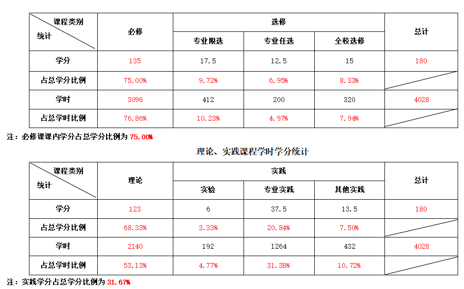 学制4年,修满180学分方能毕业。其中通识教育53学分(其中含实践13.5学分),专业教育89.5学分(其中含实践6学分),实践教育37.5学分。