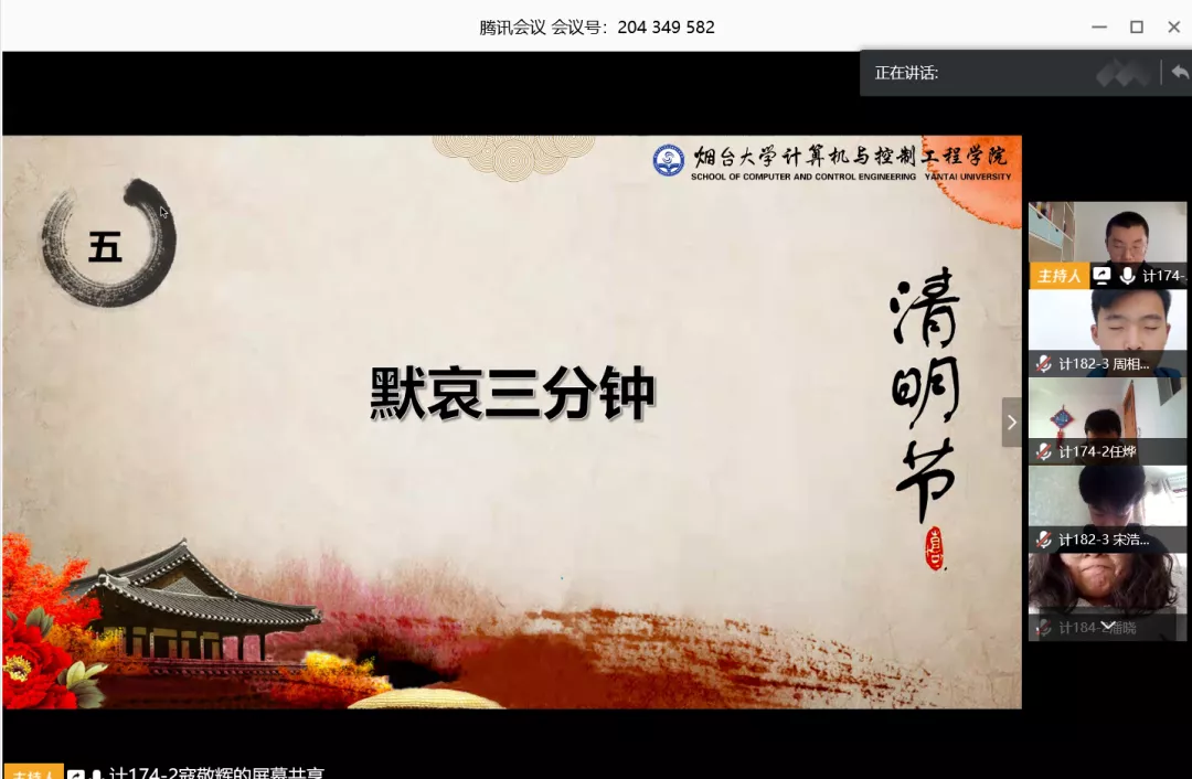赤子丹心昭日月,英雄肝胆映山河。4月4日上午,4k影视 举办了以“缅怀英烈祭忠魂,抚今追昔思奋进”为主题的清明节线上活动,缅怀革命先烈,致敬抗疫英雄,哀悼罹难同胞,并以此引导学生继承英烈遗志,传承民族精神,厚植家国情怀。本次活动在腾讯会议平台举行,学院各班级学生代表参加。