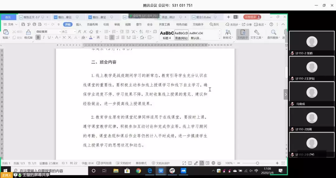 在云班会上,各班级导师以延期不延学为切入点,教育引导学生充分认识线上课程的重要性,强调线上教学是战疫期间学习的新常态,并通过鼓励学生积极上传课程笔记,分享学习经验与方法,设立问题讨论区等方式督促学生们做到课前自主预习、课上认真学习、课下巩固复习,确保学业进度不停、学习效果不降。掌握学生思想动态和学习状况,帮助解决存在的实际问题。班级导师通过学生发言与互动了解其线上学习的状态与存在的问题,并广泛听取学生对于一周以来线上教学工作的合理建议,鼓励学生积极反馈学习情况,为提高线上教育教学质量和效果贡献力量,同时引导学生保持良好的心态,努力克服困难,合理规划居家学习生活,确保在家待得住、身体好、学得进。掌握学生思想动态和学习状况,帮助解决存在的实际问题。班级导师通过学生发言与互动了解其线上学习的状态与存在的问题,并广泛听取学生对于一周以来线上教学工作的合理建议,鼓励学生积极反馈学习情况,为提高线上教育教学质量和效果贡献力量,同时引导学生保持良好的心态,努力克服困难,合理规划居家学习生活,确保在家待得住、身体好、学得进。此外,导师们带领班级同学共同学习了《山东省教育厅关于组织参加“全国大学生同上一堂疫情防控思政大课”的通知》,并根据班级情况对观看此次思政大课堂做了具体要求,教育引导学生上好疫情防控的思政课,努力提高自身的思想政治素质。
