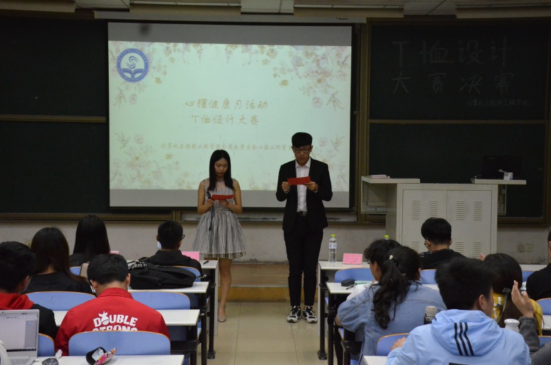 本次比赛分为线上线下两部分,由线上投票与线下设计答辩组成。比赛开始。各参赛选手分别从内容介绍、思路来源、作品内涵和启示与拓展四个方面开始答辩。其中,三号选手从"色彩筑梦,七彩心理"的原理出发,以生活中的酸甜苦辣为背景结合《北京女子图鉴》构成设计理念。她将一个代表学生们从幼而长的成长过程的小女孩与美丽与智慧的化身樱花融合,展现了在成长过程的点点滴滴,寓意即使在道路上有坎坷,只要心理健康坚强,就必定勇往直前。"化身孤岛的鲸"主题作品吸引了到场同学的目光,作品以同名歌曲出发,以蓝鲸为媒展现当下浮躁社会中人们心理的孤独,呼吁同学们勇于解决处理问题,打破困扰。而七号选手独出心裁,设计出情侣T恤,引用电影中的名句"I will always be with you",使T恤充满温情。选手们认真准备,着实为在场观众带来一场创意与视觉盛宴。在分团委学生会书记彭友程发言后,本次比赛圆满结束。杨志远、郭茹获得二等奖,让孝迪荣获一等奖。
