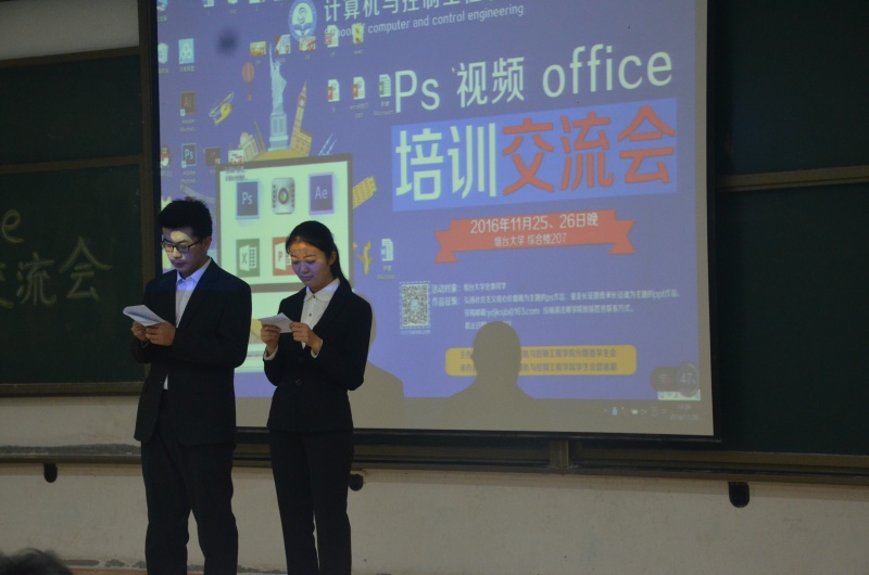 在经过检票后,同学们统一进场入座。伴随着主持人的介绍,本次培训会正式开始,首先由4k影视 信息部副部长张颖、张珩瑞等三人分别介绍和讲解Photoshop、PowerPoint以及绘声绘影和AE的用途和基本用法,并在现场进行相关软件功能的演示。随后,培训会进行问答阶段,场下观众针对绘声绘影、Photoshop等相关软件提出自己的疑问,信息部成员为观众解答疑问并传授一些应用中的小技巧。伴随着阵阵掌声,信息部部长李新星作总结发言,他对整场培训会成效表示满意,并期待同学们可以熟练作用计算机软件来解决生活中的相关问题。26日晚进行的office培训会延续前一天活动的火热气氛,4k影视 综合事务部介绍和讲解了office办公软件的用途和操作方法,并在培训会现场进行实例演示。在经过现场答疑后,伴随着掌声,本次PS、视频和office交流培训会圆满落幕。
