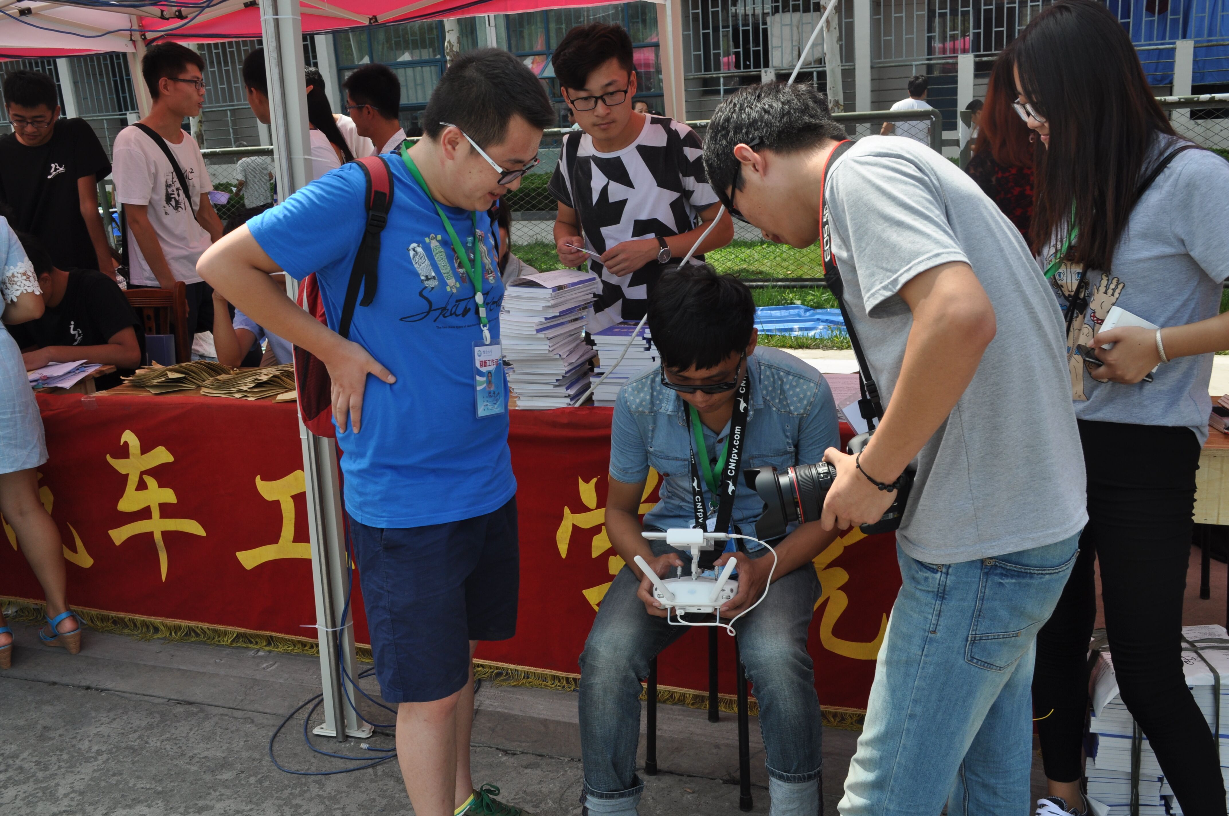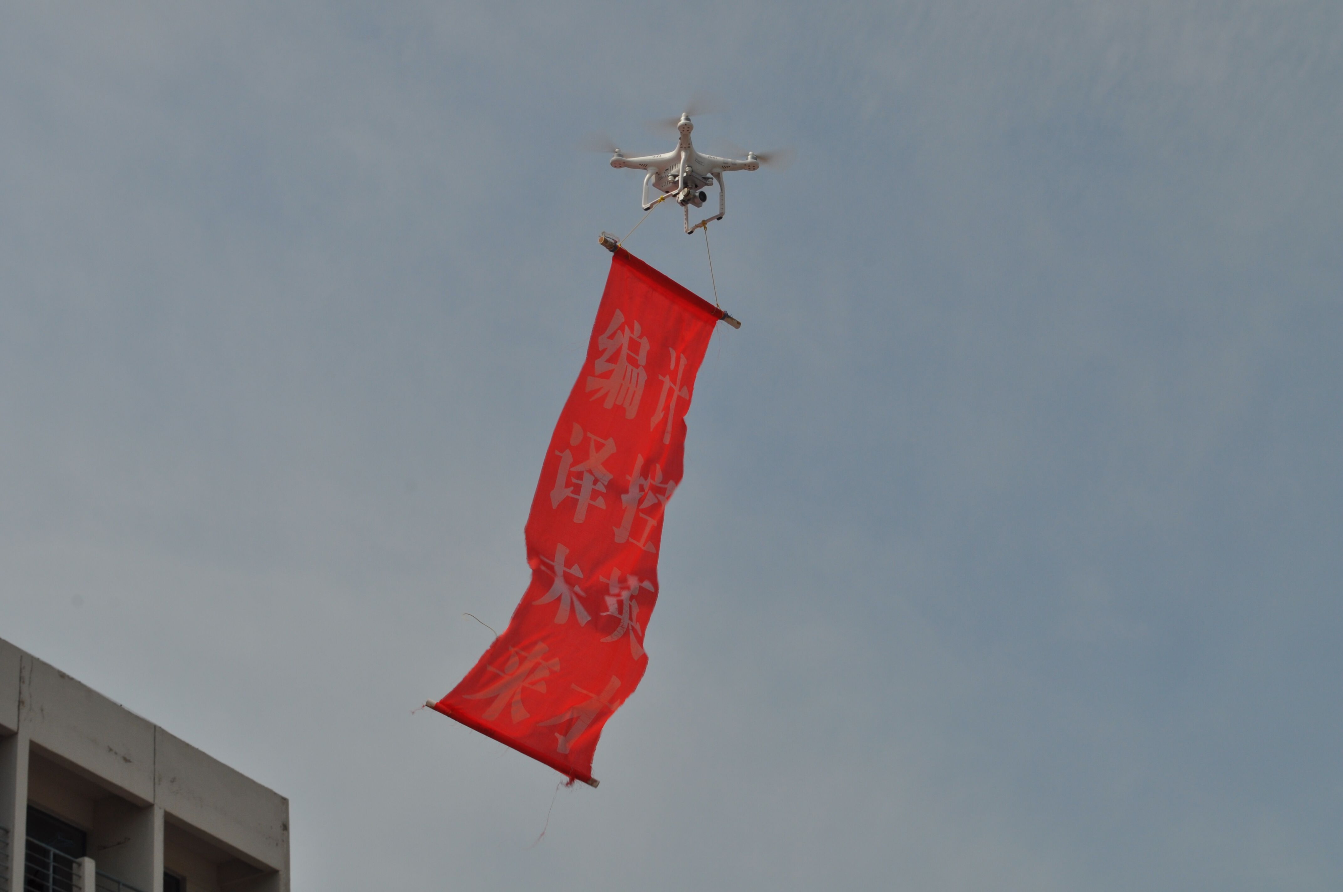 十点四十分,经过了近十分钟的调试,一架四旋翼直升机带着写有“计控英才,编译未来”的红色条幅缓缓升空。在地面操作人员的控制下,直升机上升了到了三十米左右的高空上。在烈日的照耀下,红色条幅显得格外显目。随后航模又做出了定高度平移与升降、定高度旋转等高难度的动作,博得了在场同学们的片片掌声。