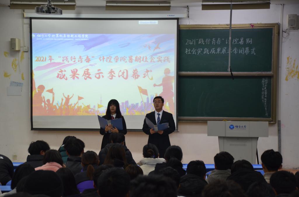 活动伊始,主持人致辞,并依次对参与本次暑期社会实践成果展的队伍进行介绍。2021年学院共619名同学自发组建80支队伍,通过答辩选出院优秀队伍11支,其中“烟育菏梦”、“数字反哺”、“ 情系润泽”、“眷注三孩”4支队伍入选为校级重点队伍。在疫情严防严控的形势下,80支社会实践队始终把安全放在第一位,通过线上为主、线下线上相结合的方式开展各种形式的社会实践活动。紧接着,优秀实践队代表依次上台对实践活动进行总结。他们主要就实践过程、成果展示和所获经验等方面展开描述,每支队伍都展现出其独特的风采,同时他们纷纷强调,社会实践离不开队员们的合理分工与及时沟通,团结一致并坚持不懈才是成功的保障。