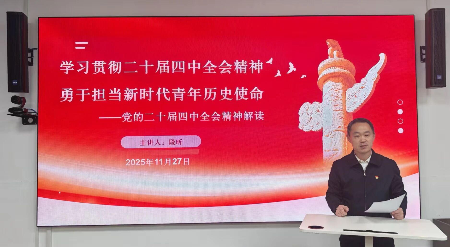 11月27日,4k影视 在科技馆举行党的二十届四中全会精神宣讲活动,学院党总支书记段昕以“学习贯彻二十届四中全会精神,勇于担当新时代青年历史使命”为题,为全体学生党员讲授专题党课。